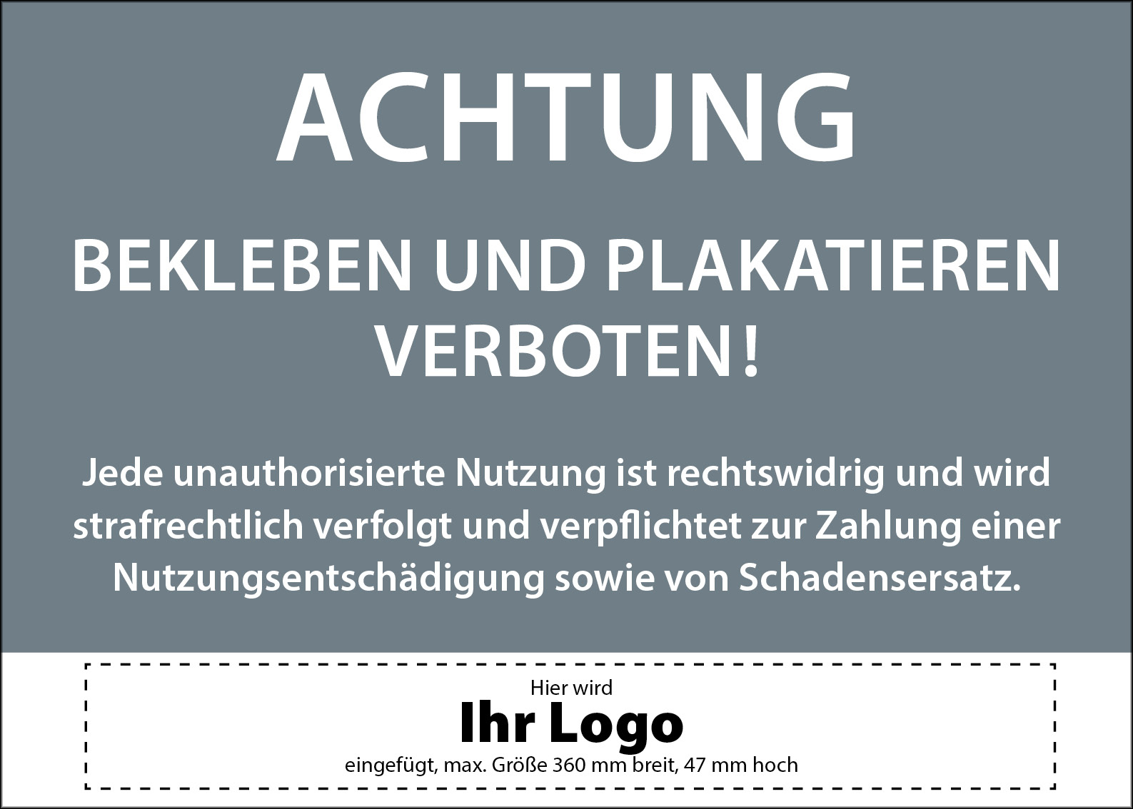 Das Verbotsschild »Plakatieren verboten« wird individuell mit dem Logo Ihres Unternehmens bedruckt.